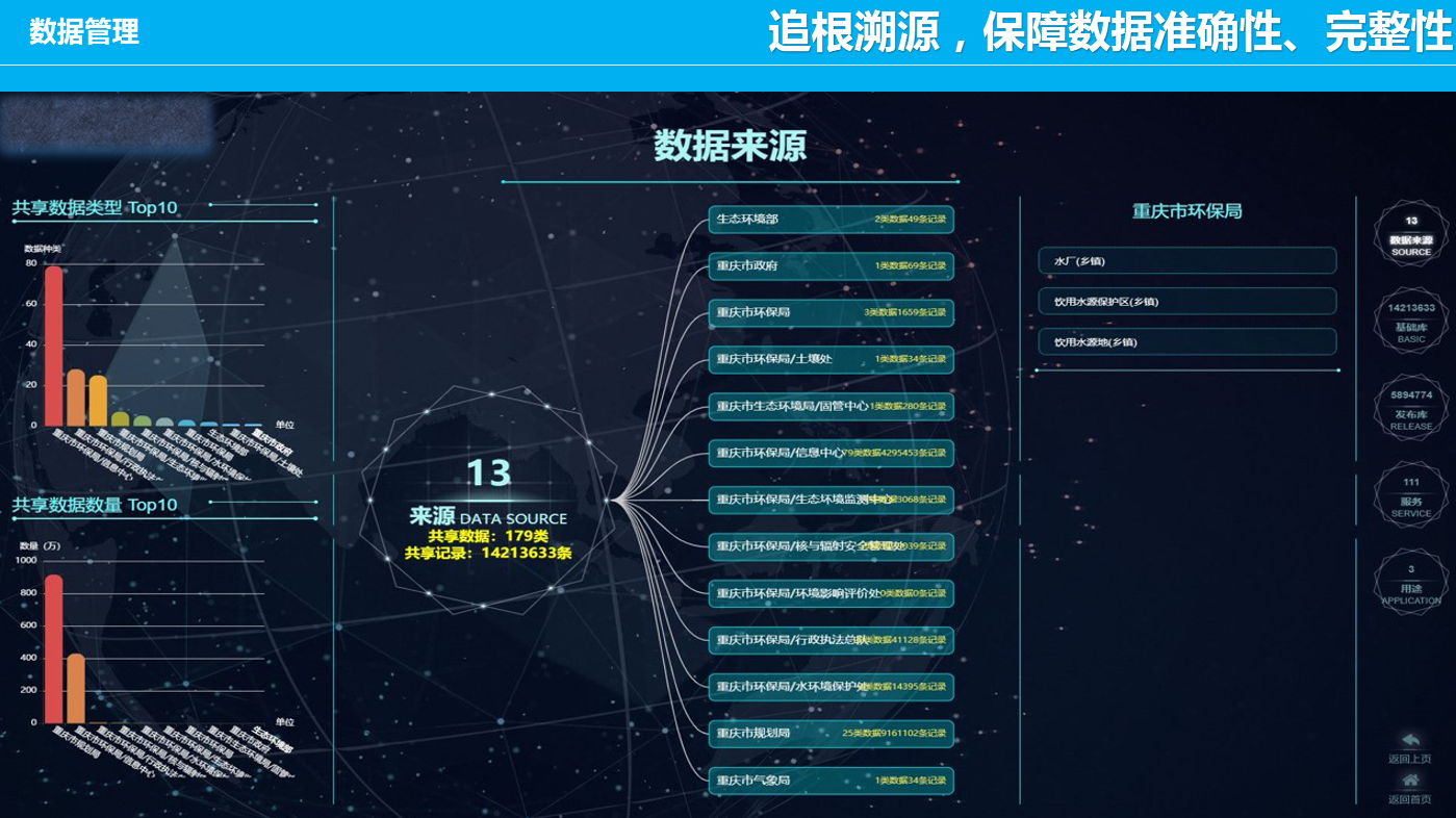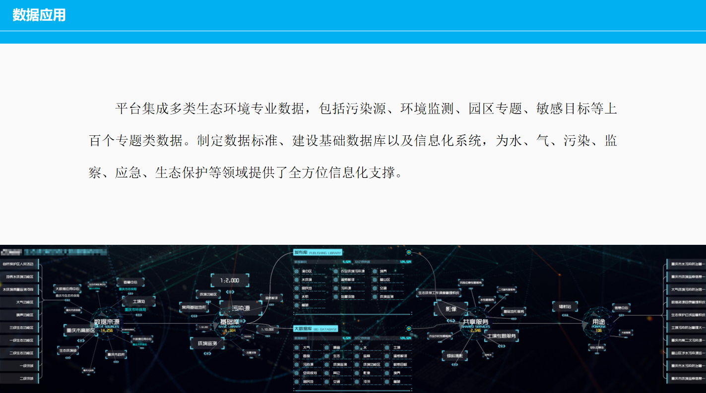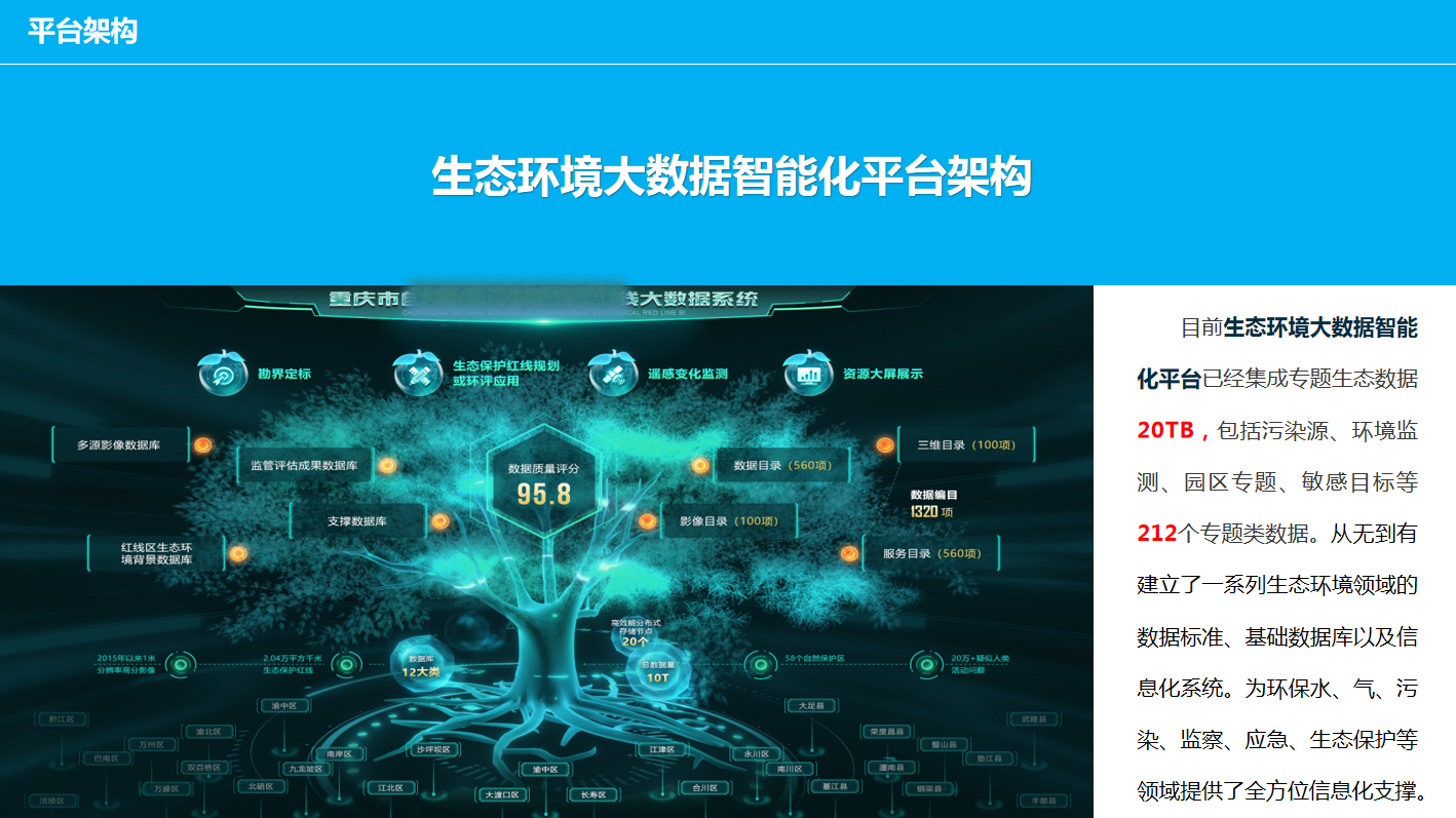 重慶數(shù)字城市科技有限公司開發(fā)研制的“生態(tài)環(huán)境大數(shù)據(jù)智能化平臺”包含了數(shù)據(jù)匯集、數(shù)據(jù)管理、數(shù)據(jù)服務(wù)發(fā)布、數(shù)據(jù)共享、數(shù)據(jù)應(yīng)用、數(shù)據(jù)展示幾個層級應(yīng)用,每個層級包含公司自行研發(fā)的業(yè)務(wù)邏輯模塊和算法模塊,且每個層級都擁有相應(yīng)的大數(shù)據(jù)展示頁面,能夠智能的進行數(shù)據(jù)的抽取、清洗、校驗,并適應(yīng)多平臺終端應(yīng)用,是一套專門服務(wù)于生態(tài)環(huán)境領(lǐng)域多源、多種類數(shù)據(jù)匯集、管理、發(fā)布、共享和展示的一體化智慧環(huán)保解決方案。