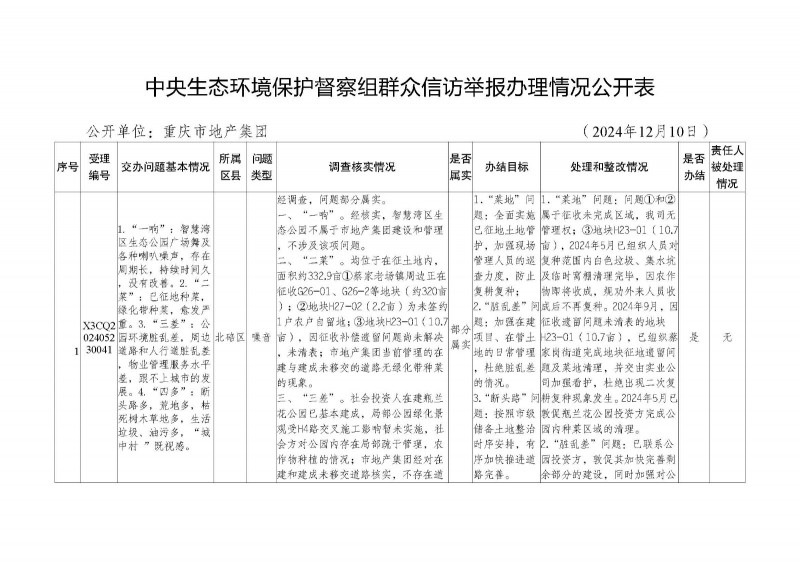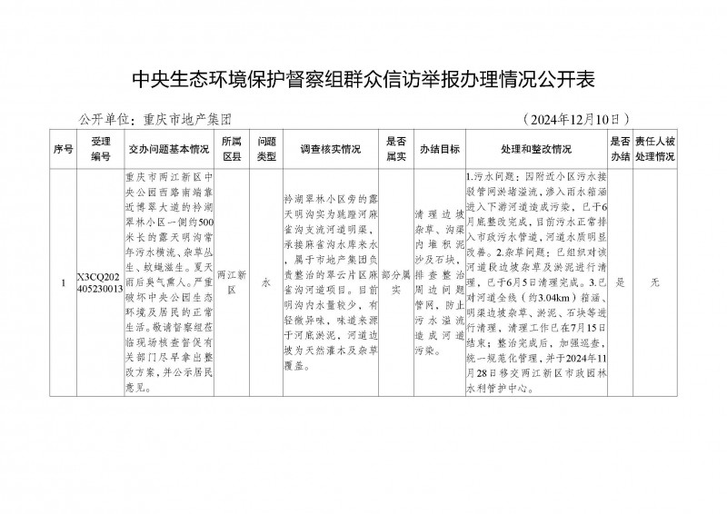 根據(jù)《關(guān)于加強(qiáng)中央生態(tài)環(huán)境保護(hù)督察交辦群眾舉報(bào)件辦理工作的通知》(渝環(huán)督辦發(fā)〔2024〕13號(hào))要求,群眾舉報(bào)件辦結(jié)驗(yàn)收后,各整改責(zé)任單位應(yīng)填寫(xiě)舉報(bào)辦理情況公開(kāi)表,在區(qū)縣、市級(jí)部門(mén)或市屬國(guó)有重點(diǎn)企業(yè)門(mén)戶網(wǎng)站上對(duì)外公示群眾舉報(bào)件辦理情況,接受社會(huì)和群眾監(jiān)督,公示期應(yīng)不少于10個(gè)工作日?,F(xiàn)按照生態(tài)環(huán)保督察相關(guān)要求對(duì)受理編號(hào)X3CQ202405230041、X3CQ202405230013兩件群眾舉報(bào)辦理情況公開(kāi)表對(duì)外公示,公示時(shí)間為2024年12月12日-12月25日,聯(lián)系電話:63629733。